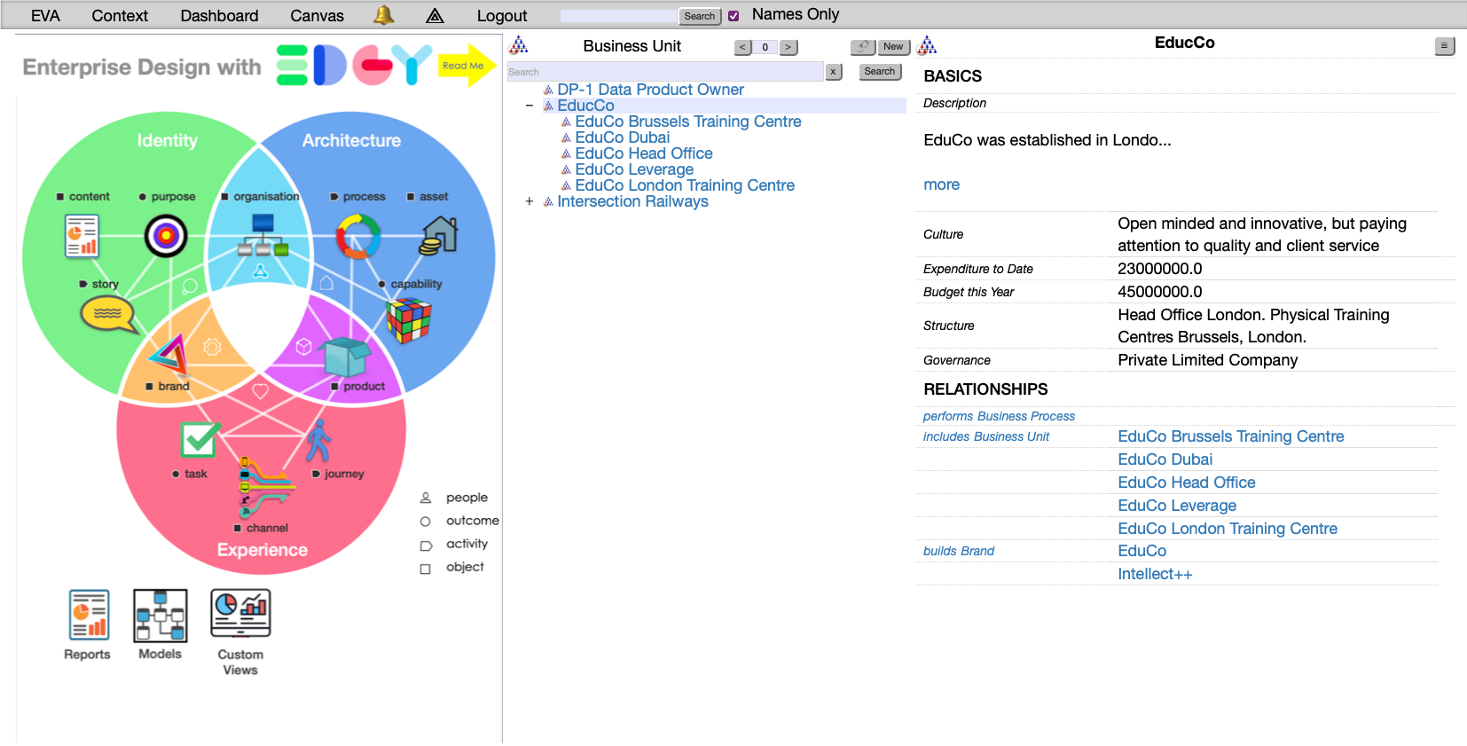 You will be using a shared sandbox version of EDGY-EVA. We encourage the shared sandbox approach so you can see a larger set of existing architecture content which helps to get a feel for content in the tool. This means there will be content in the tool that others have created as part of their evaluation that you can see (and modify) and vice-versa.