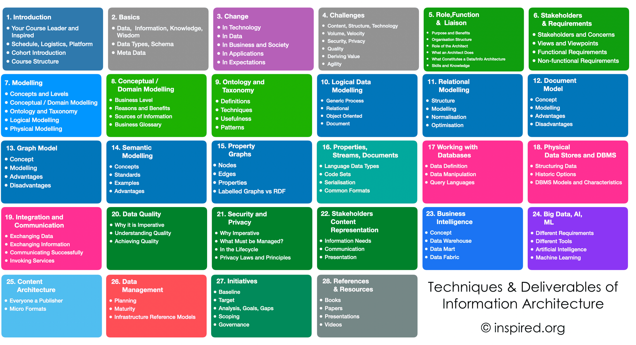 Course content includes (subject to change) detailed coverage of data, information and knowledge architecture, including: